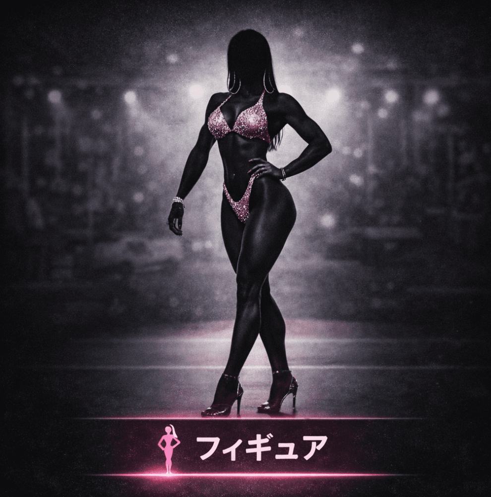- 特徴:全体のバランスとアウトラインが重視される。筋肉量は”つけすぎない”。さらにメイクや髪型を含めたトータルな美が追求、女性らしい華やかさを競うカテゴリー。